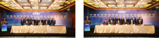 ????主要簽約項(xiàng)目包括:中國船舶集團(tuán)所屬重慶川東船舶重工有限責(zé)任公司與中遠(yuǎn)海運(yùn)(上海)有限公司1.38萬噸不銹鋼化學(xué)品船項(xiàng)目;中國船舶集團(tuán)所屬大連船舶重工集團(tuán)有限公司與招商輪船VLCC項(xiàng)目;中國船舶集團(tuán)所屬上海外高橋造船有限公司與工銀租賃21萬噸散貨船項(xiàng)目、外高橋造船與EPS公司20.9萬噸雙燃料散貨船項(xiàng)目;中國船舶集團(tuán)所屬江南造船(集團(tuán))有限責(zé)任公司與太平洋氣體公司VLEC項(xiàng)目、江南造船與 SINOGAS86000立方米VLGC項(xiàng)目、江南造船與UECC公司3600車汽車滾裝船項(xiàng)目、江南造船與派格達(dá)克公司22000方乙烯船項(xiàng)目;中國船舶集團(tuán)所屬廣船國際有限公司與斯坦納公司5萬噸甲醇雙燃料油船項(xiàng)目、廣船國際與EPS公司LNG雙燃料蘇伊士油船項(xiàng)目、中國船舶集團(tuán)所屬滬東中華造船(集團(tuán))有限公司與MOL18600立方LNG加注船項(xiàng)目;中國船舶集團(tuán)所屬武船集團(tuán)青島北海船舶重工有限責(zé)任公司與中國船舶集團(tuán)所屬中船租賃21萬噸散貨船項(xiàng)目、中國船舶集團(tuán)所屬中船澄西船舶修造有限公司與國銀租賃85000噸散貨船項(xiàng)目、重慶川東船舶重工與重慶冠達(dá)世紀(jì)游輪650客游輪項(xiàng)目;中國船舶租賃與 Golar LNG 船舶改裝融資租賃項(xiàng)目、中國船舶租賃與SINOGAS86000立方米VLGC融資租賃項(xiàng)目;中船租賃與山東海運(yùn)21萬噸散貨船融資租賃項(xiàng)目、中船租賃與Navig 8 成品油船聯(lián)合投資協(xié)議、中船租賃與新加坡星展銀行VLCC融資協(xié)議。