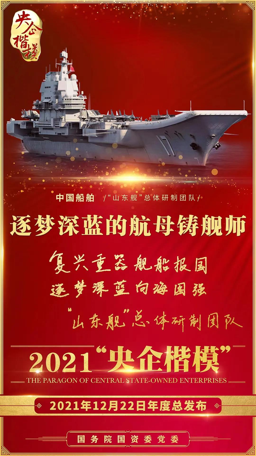 12月22日,國務院國資委黨委舉行2021年第二批“央企楷模”發布暨年度總發布儀式,中國船舶“山東艦”總體研制團隊榮獲2021年“央企楷模”榮譽稱號。繼“奮斗者”號萬米載人潛水器研發團隊獲評2020年“央企楷模”榮譽稱號后,中國船舶集團再獲此殊榮。