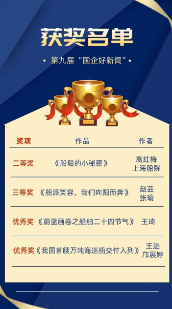 近日,第九屆“國企好新聞”獲獎作品正式揭曉,中國船舶集團斬獲4項大獎,涵蓋科普類、影音類、圖片類、文字類等多種體裁。其中,二等獎1項、三等獎1項、優(yōu)秀獎2項。
