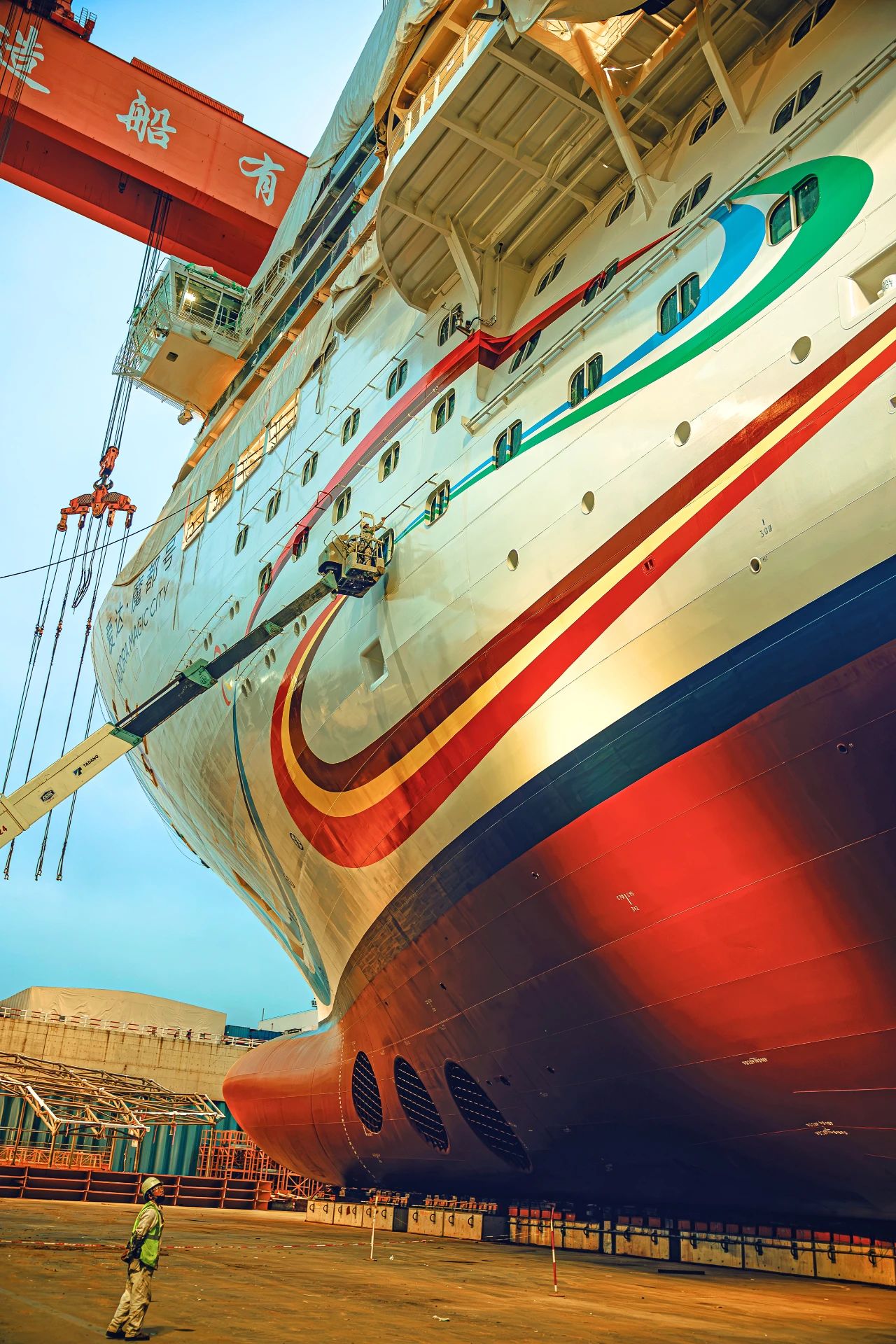 照片攝于國產(chǎn)首艘大型郵輪首次出塢前夕,拍攝時(shí)期為傍晚,船塢開啟燈光照明,工人在對船身做最后的涂裝修飾工作。這樣的角度觀看國產(chǎn)首艘大型郵輪令人無比震撼。
