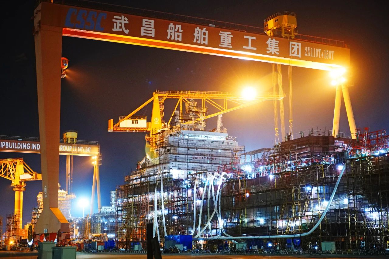 在武漢船機(jī)平臺總裝現(xiàn)場,華夏金租神大平臺配套的1200噸起重機(jī)正在安裝,大件吊裝各項(xiàng)準(zhǔn)備工作繁瑣,一切就緒時(shí),天已經(jīng)黑了,現(xiàn)場一鼓作氣開始吊裝對接,展現(xiàn)了船舶人只爭朝夕、不負(fù)韶華、忘我工作精神風(fēng)貌。