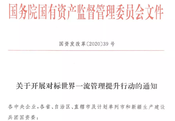 6月13日,國(guó)資委正式印發(fā)《關(guān)于開展對(duì)標(biāo)世界一流管理提升行動(dòng)的通知》(以下簡(jiǎn)稱《通知》),對(duì)國(guó)有重點(diǎn)企業(yè)開展對(duì)標(biāo)提升行動(dòng)作出部署安排。