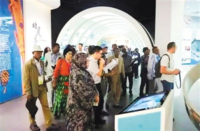 來自非洲12個發(fā)展中國家基礎(chǔ)設(shè)施建設(shè)及規(guī)劃相關(guān)部門的高級官員在徐工集團(tuán)展廳內(nèi)參觀。