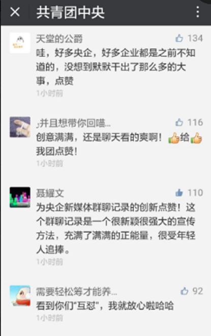 “‘央企新媒體群聊記錄’刷屏是央企新媒體親民傳播風格的正向反饋,能引發(fā)受眾共鳴的話題加上激發(fā)和感染的受眾,從而引發(fā)了積極的再傳播力量”,人民網輿情監(jiān)測室常務副秘書長單學剛同樣不諱受眾在其中的作用。