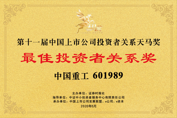 ????中國船舶集團(tuán)旗下中國重工于近日榮獲由證券時報(bào)社主辦的“第11屆中國上市公司投資者關(guān)系天馬獎——最佳投資者關(guān)系獎”,滬深兩市共有100家上市公司獲得該獎項(xiàng)。