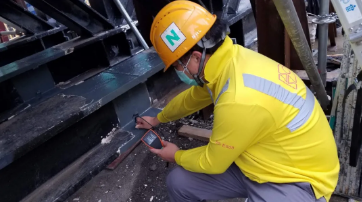 泛廣公司員工在香港大埔運(yùn)動場工地檢測油漆厚度