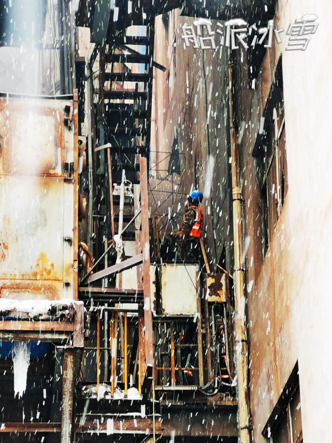 “雪花飄、北風蕭,寒梅立雪只為船人香!”撫鋼項目組成員在撫順現場冒雪施工。