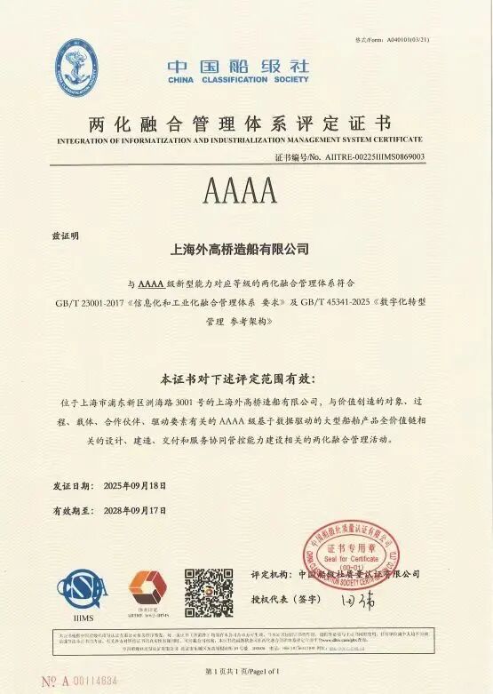 日前,全國兩化融合管理體系評定工作委員會公布兩化融合管理體系3.0和數字化轉型管理體系首批4A/5A級評定企業名單,中國船舶集團有限公司旗下外高橋造船成為首批29家獲證的企業之一,也成為首批獲得4A級認證的船海企業。