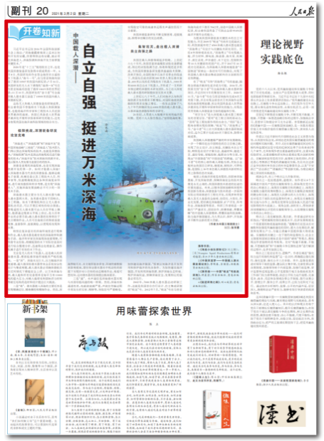 3月2日,人民日報 “開卷知新” 專欄刊發(fā)“蛟龍?zhí)枴笨傇O計師中國工程院院士中國船舶集團七〇二所研究員徐芑南文章《中國載人深潛——自立自強 挺進萬米深海》。