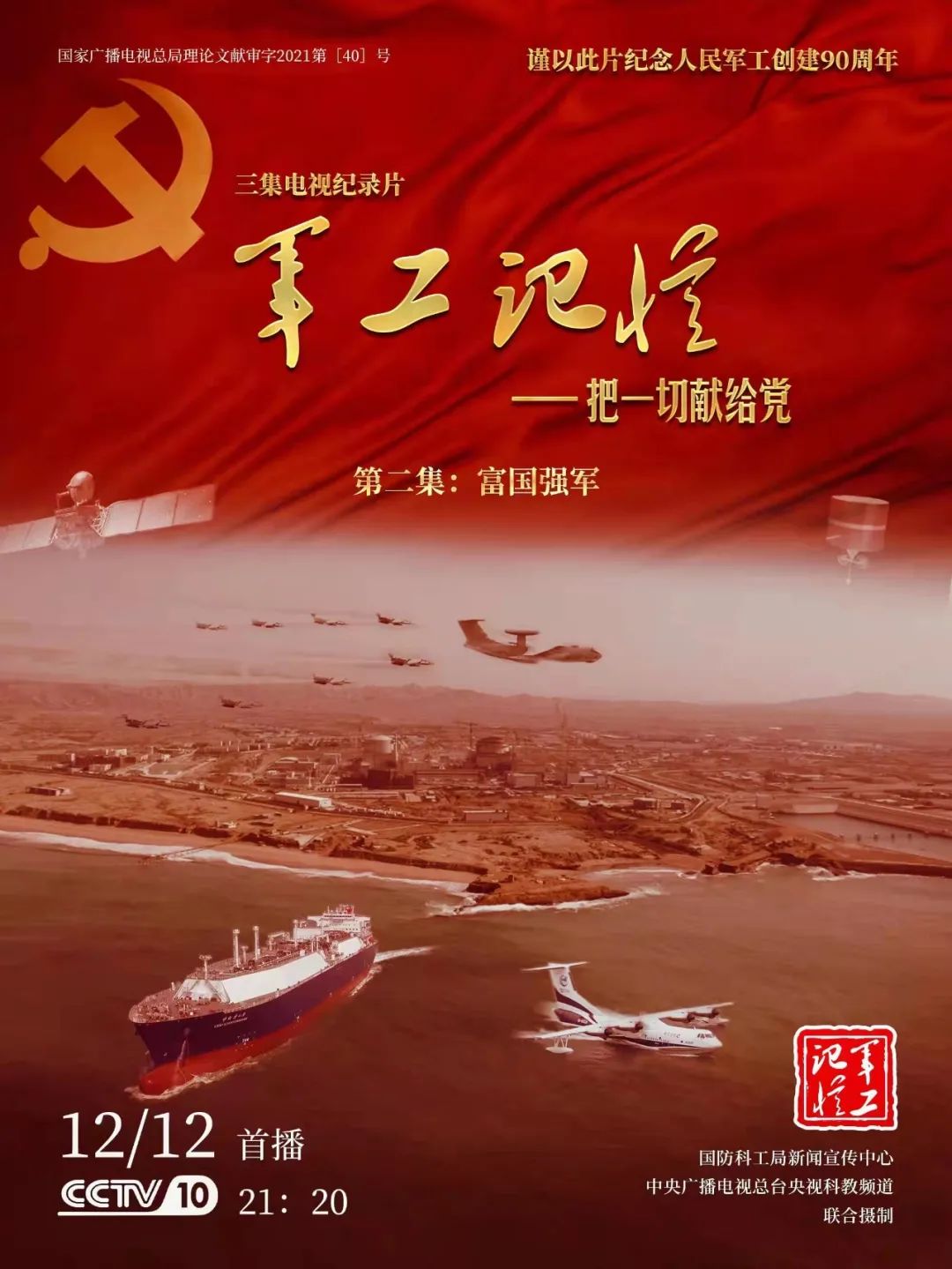 為慶祝中國共產(chǎn)黨成立100周年,紀念黨領導下的人民軍工創(chuàng)建90周年,由國防科工局指導,國防科工局新聞宣傳中心聯(lián)合中央廣播電視總臺社教節(jié)目中心攝制,各軍工集團大力支持的3集重大理論文獻電視紀錄片《軍工記憶——把一切獻給黨》,將于12月11日21:20在央視科教頻道(CCTV-10)《探索發(fā)現(xiàn)》欄目首播,連續(xù)播出3天。該紀錄片旨在向建黨百年獻禮,向人民軍工90周年致敬,向全社會弘揚軍工精神傳遞軍工文化,激勵國防科技工業(yè)戰(zhàn)線廣大干部職工不忘初心、接續(xù)奮斗,為實現(xiàn)強軍強國夢想貢獻力量。