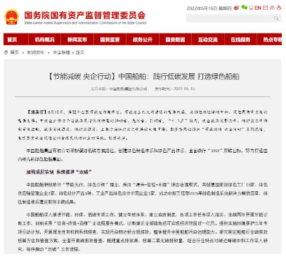 【編者按】6月13日,第32個全國節(jié)能宣傳周開啟。節(jié)能是生態(tài)文明建設(shè)的重要內(nèi)容,是推進碳達峰碳中和、促進高質(zhì)量發(fā)展的重要支撐。中央企業(yè)努力爭當(dāng)能源清潔低碳轉(zhuǎn)型的推動者、先行者、引領(lǐng)者,“十三五”期間,央企能源消費總量、碳排放總量得到有效控制,能源消耗強度、碳排放強度、主要污染物排放總量持續(xù)大幅下降。6月16日,國資委網(wǎng)站在“節(jié)能減碳 央企行動”系列報道中,展示中國船舶集團有限公司促進社會綠色低碳的生動實踐。