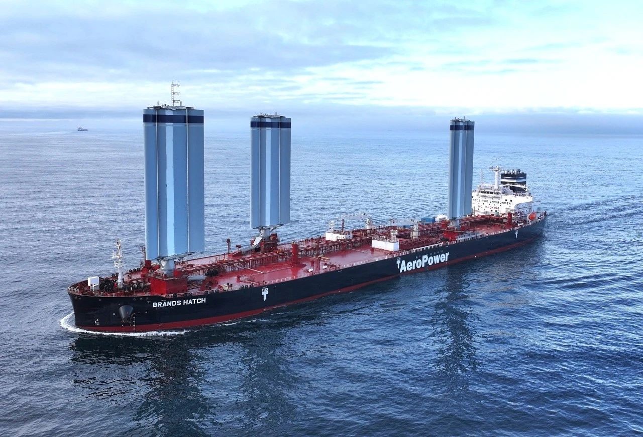 風能作為一種可再生能源,以其高性價比成為業(yè)內研究船舶推力的新方向。“BRANDSHATCH”號以將傳統(tǒng)風能轉化為智能化現(xiàn)代推進力為核心技術顛覆點,配備三具高度超過40米的硬質翼型風帆,在航行中能夠依托數(shù)字控帆系統(tǒng)根據(jù)氣象數(shù)據(jù)實現(xiàn)實時智能動態(tài)調整帆角,通過機械液壓傳動系統(tǒng)實現(xiàn)升降、開合和旋轉,為船舶提供額外推力,從而大幅減少主機的燃油消耗,有效提升船舶運營效能。