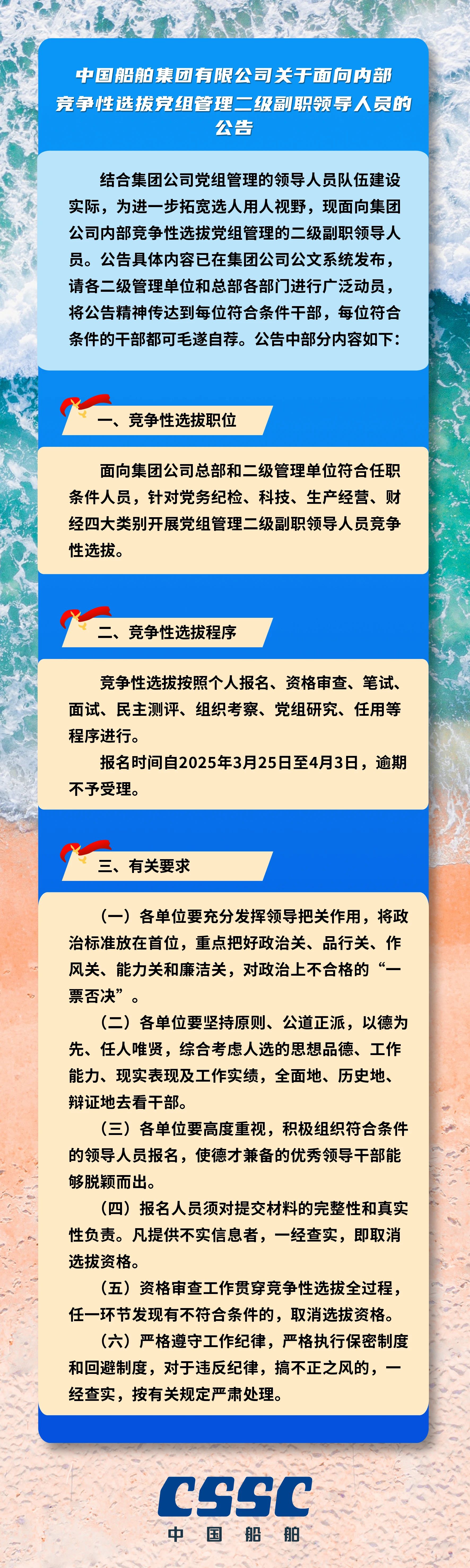 中國船舶集團有限公司關于面向內部競爭性選拔黨組管理二級副職領導人員的公告